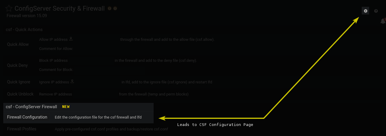 The Firewall Configuration button provides direct access to CSF’s internal configuration page, allowing users to modify /etc/csf/csf.conf through a graphical interface instead of editing the file manually.