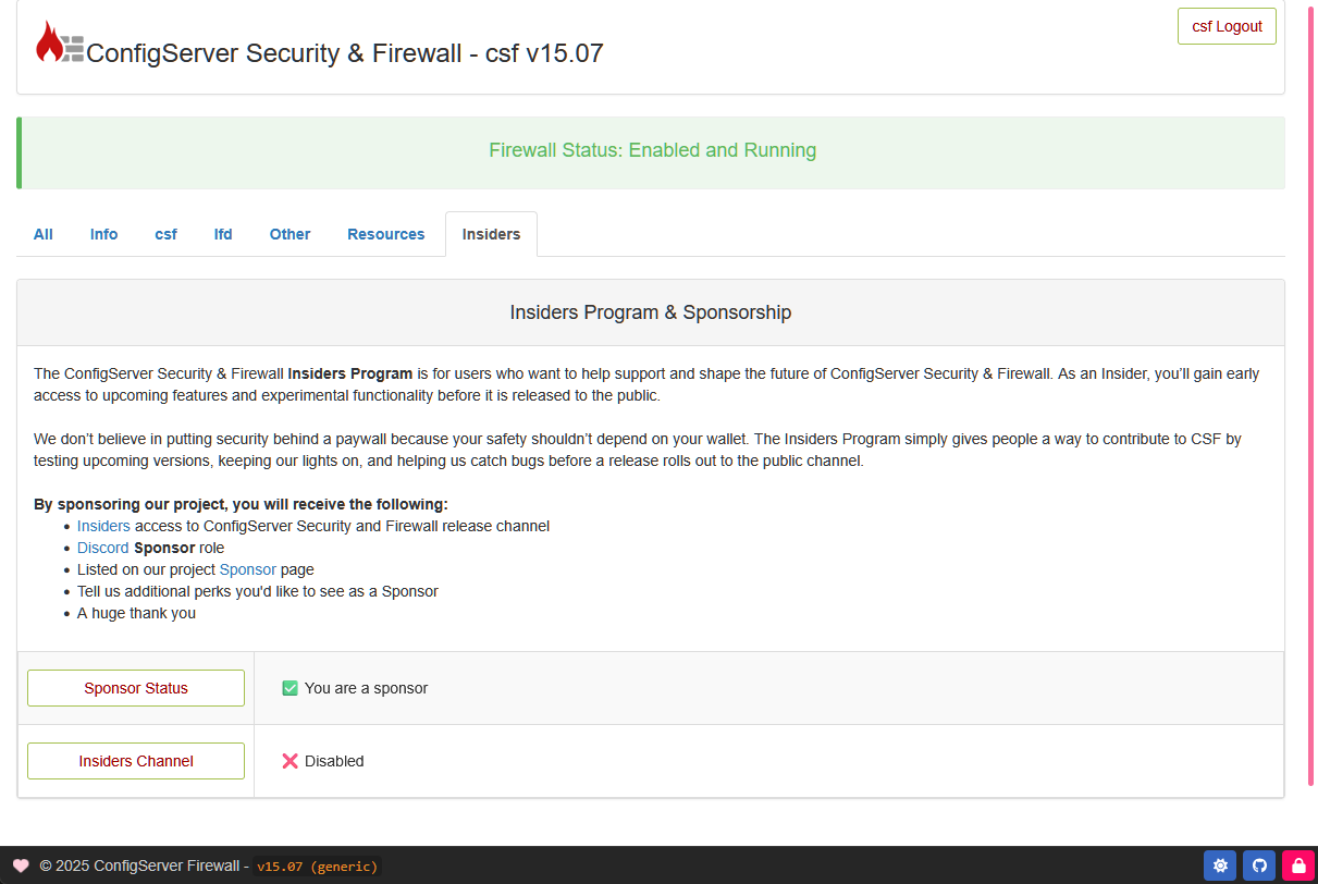 Once CSF has restarted, you can verify the status of your Insiders configuration by one of the following methods: